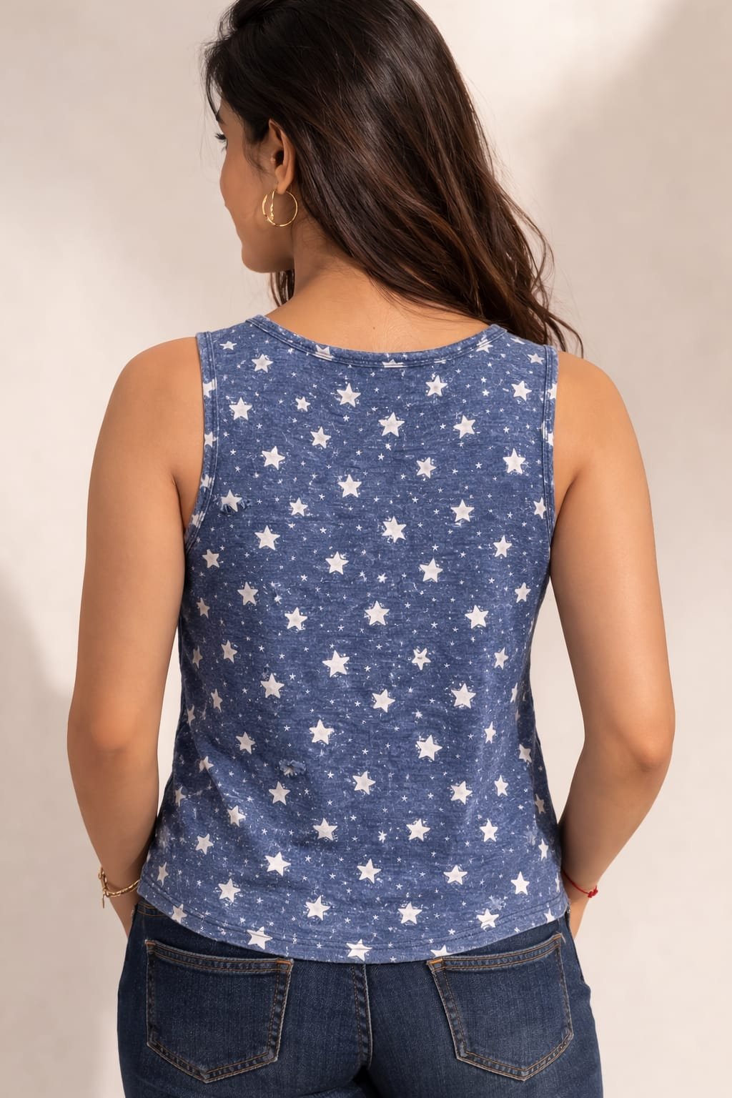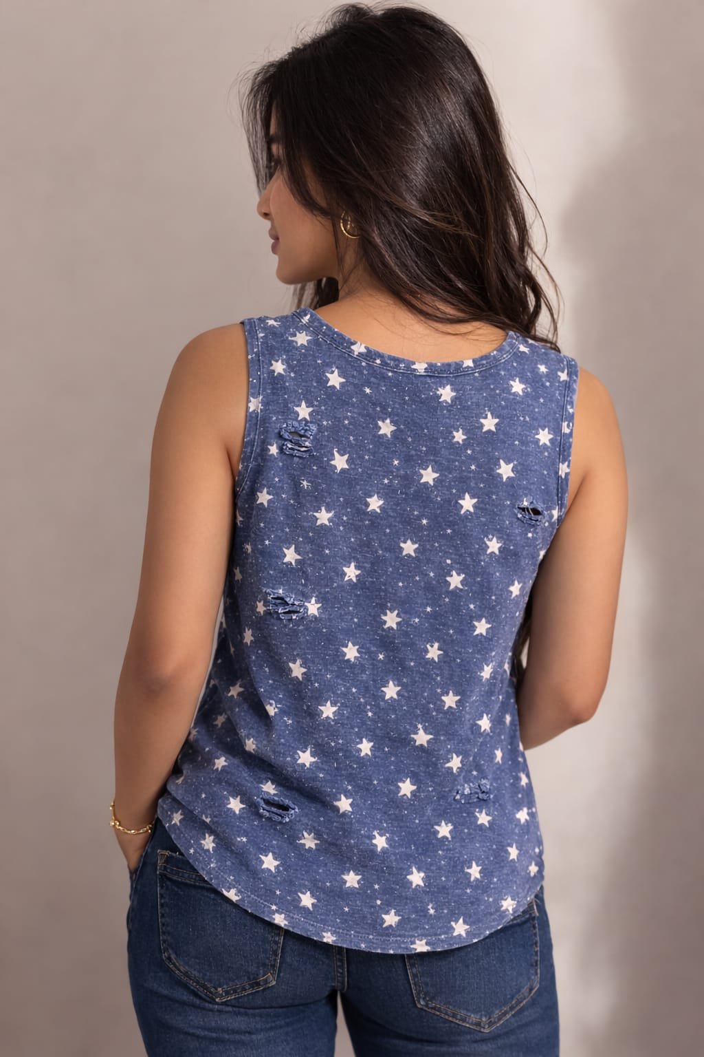 blue star printed sleeveless distressed tank topBlue Star-Printed Sleeveless Distressed Tank Top