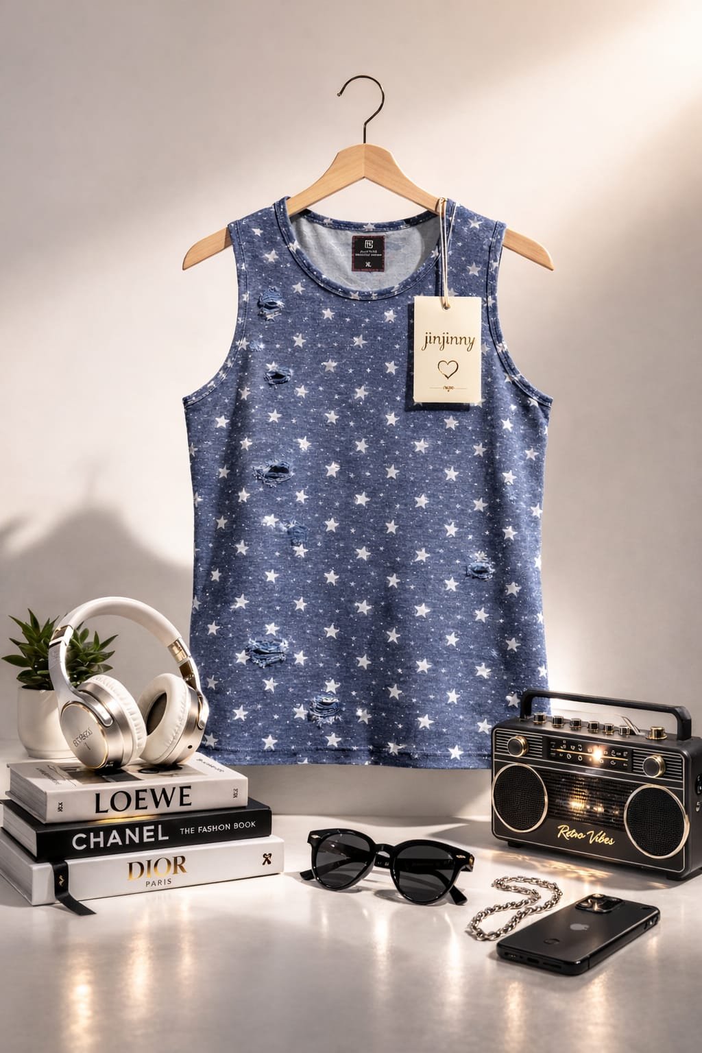 Be the first to review “Blue Star-Printed Sleeveless Distressed Tank Top”