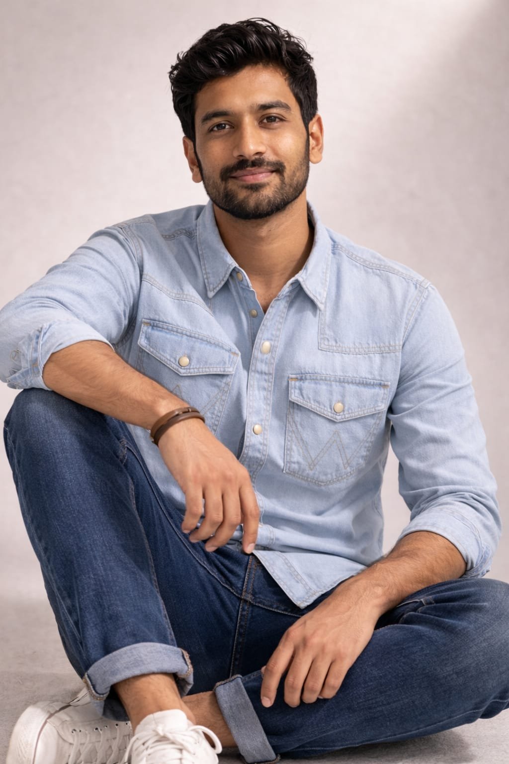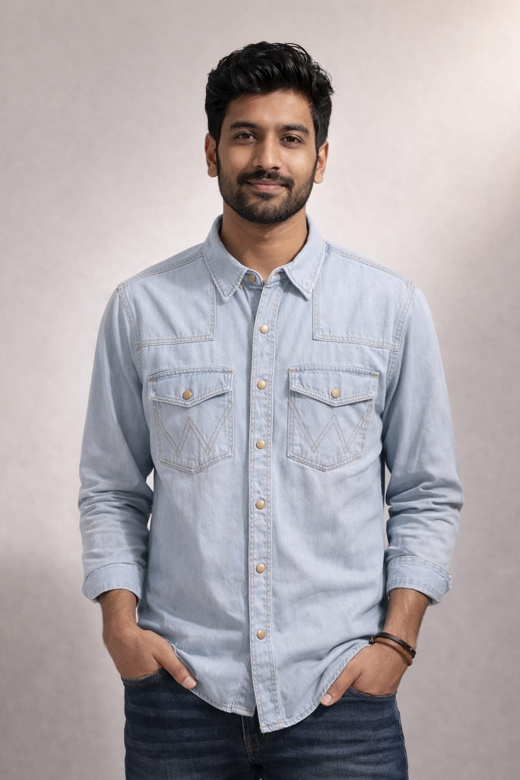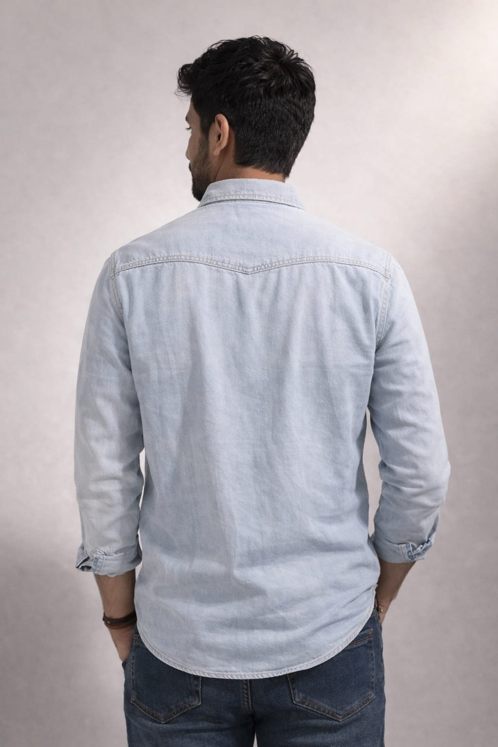Description : Refresh your casual collection with this blue denim shirt for men. Tailored from durable cotton, it ensures comfort and longevity. The long sleeves make it versatile for different seasons and the ring snap buttons offer easy wear. The double flap pockets enhance this shirt’s functionality, while the subtle leather branding on the pocket flap adds a unique touch. The garment denimax wash gives a comfortable feel. Wear this men’s shirt with slim-fit jeans and high-top sneakers for added edge.